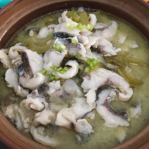 鱼肉一片片摊开放入高汤里,大火一分钟就好了,不要搅拌,以免鱼肉煮散开,最后一锅倒入骨头和酸菜盆里