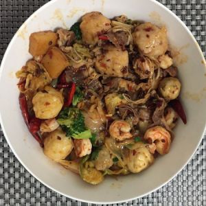 大虾去虾线去皮留虾仁装盘备用(也可以直接用大虾,个人觉得还是去虾线卫生又美味!)西兰花,金针菇洗完用开水焯2分钟左右,控水晾干装盘备用!包生菜洗好撕成小片装盘备用!鱼丸等丸子也是开水焯3分钟左右控水备用!切好的葱花,干辣椒,蒜末,姜片放在一个小碗里备用!