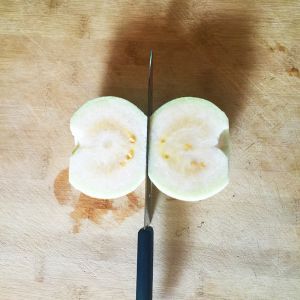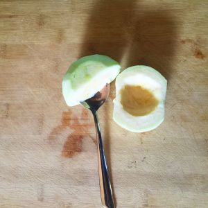 用勺子挖掉番石榴的籽(有些人不喜欢吃番石榴籽,而且番石榴籽不容易消化,所以我去掉了,如果喜欢吃的人也可以不去)