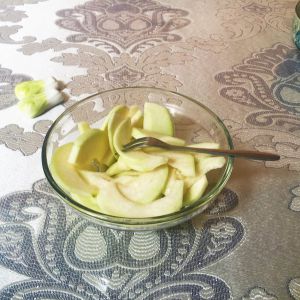 加入盐、糖、米醋,搅拌以后研制10分钟左右就可以开吃,心急的人直接开吃也行,不过没有腌制后的好吃,口感是入口酸酸的,咀嚼的时候有淡淡的甜味回味,开始就停不下来。腌制后的番石榴没有了原本果实的生味,非常适合因为孕吐而胃口不好的孕妇,和厌食的小宝宝开胃。同时也是预防孕高症和孕期糖尿病的优良水果。