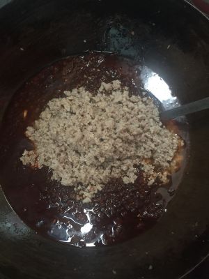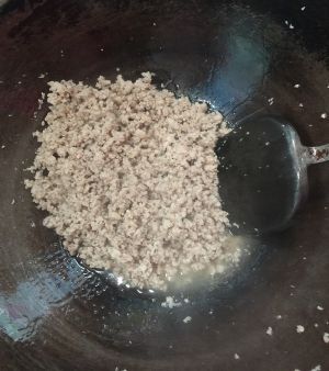 锅中倒入适量的油,把肉末放进去炒干水分后盛起来!
