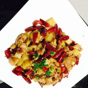 捞出鸡肉 把干辣椒花椒蒜姜倒入锅中炒
