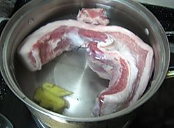 五花肉洗净后,放入锅内,加入冷水,放几片切好的姜片,一同大火烧开,撇去浮沫,中火煮至肉熟大概10分钟左右