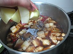 肉熟后,取出凉晾,切成麻将般大小的块,放入锅内,加入干辣椒,八角,桂皮,剩下的姜片,老抽,料酒,冰糖,加入开水,以没过肉为准,大火烧开,转中火加盖一个小时