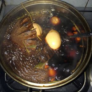 煮好的鸡蛋用凉水冲洗一会,趁热敲破蛋壳。重新放入泡着配料的水,加适量酱油,盐,鸡精,和一两颗冰糖。
