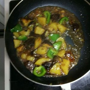 葱蒜爆锅(半根葱,三个蒜),青椒炒,调料汁,土豆茄子,翻拌均匀,大火收汁。