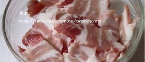 五花肉洗干净切薄片,如果觉得不好切,可以先把五花肉放冰箱的冷冻室冷20分钟,变硬了就很好切了啦