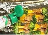 把西兰花,黄椒块和五花肉相隔串起来,一块荤的一块素的,搭配着吃不腻嘛,也养眼哈哈