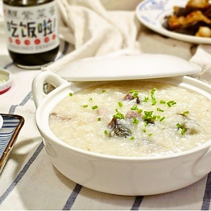 再次沸腾后放入一半皮蛋继续熬到比喜欢的黏稠度更稀一些的时候,放入剩余的皮蛋和瘦肉丁,加盖关火焖5分钟即可
