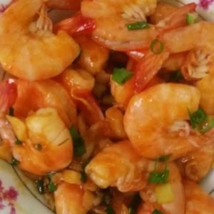 葱姜蒜爆香以后,倒入虾,翻炒到变红,,加入番茄酱搅拌到每只虾均匀裹上酱,放糖和盐调味,,加稍许水翻炒收汁,,
