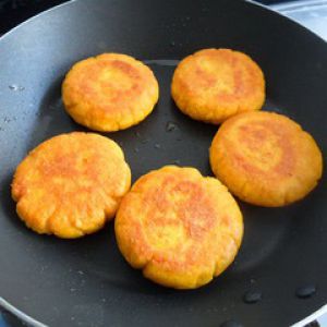 平底锅稍稍预热,抹上一层薄油,放入南瓜饼煎成两面金黄熟透即可