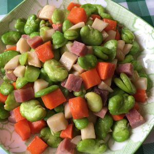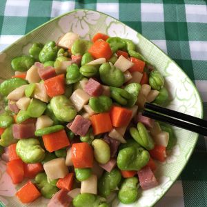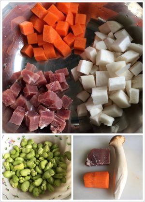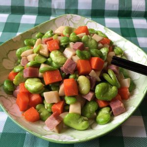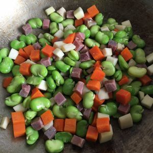 豆瓣剥肉,火腿肉、胡萝卜、杏鲍菇切丁备用;