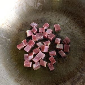 锅中加少许橄榄油,放入火腿丁,爆出香味,肉稍变色;