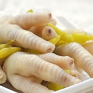 把冲洗好的鸡爪放入容器中,放入泡椒