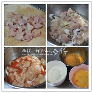 鸡肉腌好后,控掉水分,再去掉葱姜段。接着取一块鸡肉,先沾上一层面粉。