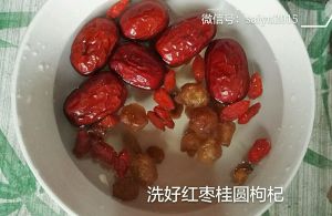 洗好红枣桂圆枸杞,加入鱼胶中