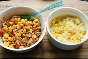 再做一份金枪鱼口味的,做法很简单,过程省略哈,就是把甜玉米粒和胡萝卜煮熟拌上自己喜欢口味的金枪鱼罐头,再放一点沙拉酱搅拌均与即可。