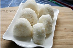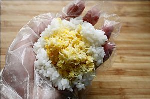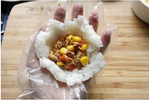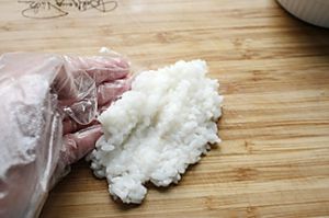把拌好寿司醋的米饭放到案板上用手揉搓,就像揉面一样,这样揉好的面团更容易包饭团,内馅不易外露。
