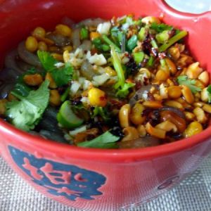 取空碗,放入两大勺辣椒粉八颗八角一小勺花椒,将刚才炸完花生和黄豆的油大火烧热至略冒烟时关火,倒入碗中三分之一并用筷子快速搅动,过一分钟再倒入三分之一,再过一分钟全部倒入。也就是说油是分三次倒入。