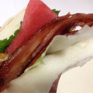 放一叶白菜、培根、酸奶、煎蛋、一片西瓜、2片薄荷叶依次放入馒头中间