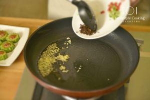 锅烧热,放油,把苦瓜放入煎香定型,两面都煎一下。