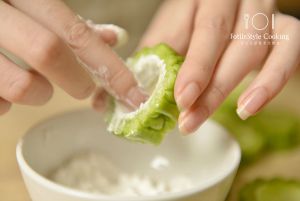 往苦瓜中间抹上一层薄薄的生粉