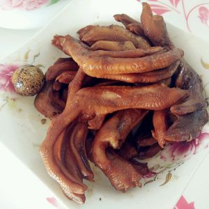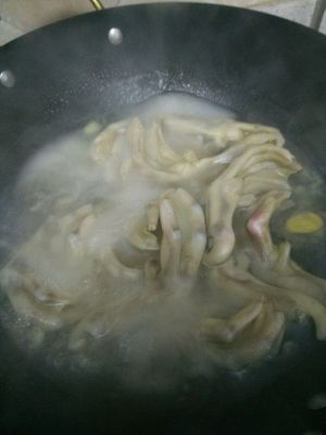 卤水开后煮十来分钟,然后放入你要卤的东西!我卤的鸭爪,事先焯过!清水烧开放入姜片,料酒,再放入鸭爪煮四五分钟,将鸭爪捞起来放入冷水中!