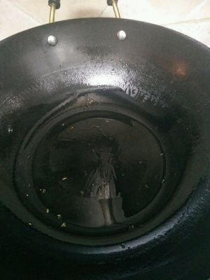 炒锅烧热,放一点点油,拿着锅轻轻地颠,保证锅底部油分布均匀,烧热以后,关小火!