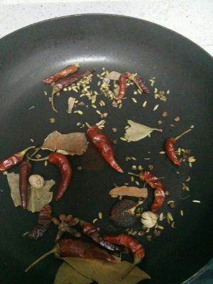 准备好香料,将炒锅烧热,将香料和辣椒,花椒放进去,不断翻炒,直到香味出来,关火!
