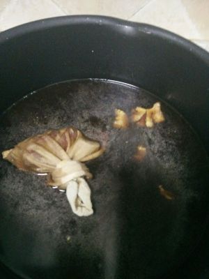 大火煮,放入姜和香料包,开了以后放适量老抽!