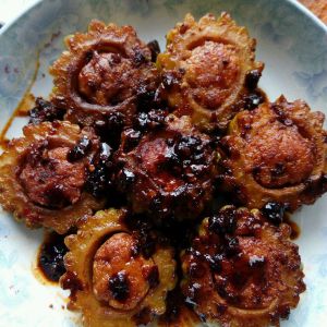 苦瓜洗净,切成厚2~3㎝的小段,去囊,将肉塞进去