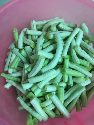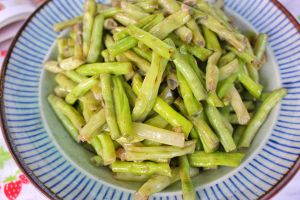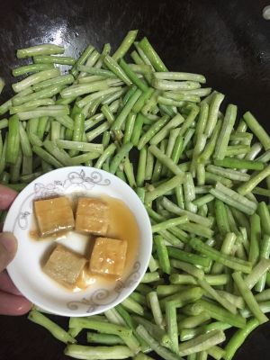用铲子将腐乳压烂、翻炒,加10-20g水一起翻炒,直至腐乳和豆角融合。加80g水、糖,盖盖煮至豆角熟,开盖将水份炒干,腐乳汁粘在豆上即可