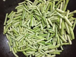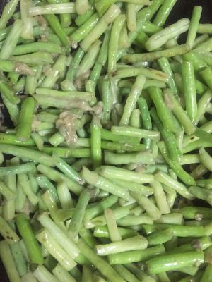 加入豆角,先摊平让豆角都受热了再炒,炒时如果锅红、快要冒烟,就在锅边加10g左右水,继续翻炒