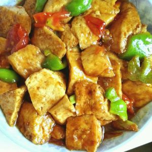 下调料加配菜,煎好的豆腐下锅,加酱油,加水适量,开锅后加淀粉,淋香油,出锅。
