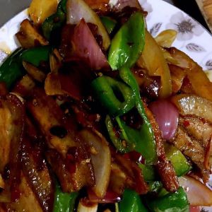 放入青椒和洋葱翻炒均匀。加入料酒,糖,盐适量!