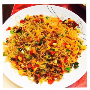 、放入郫县豆瓣炒出红油,放入姜蒜粒、红黄彩椒粒、煸炒片刻,后放入粉丝,拌匀。