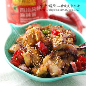 放入穿过油的鸡丁翻炒,加入白糖,淋上生抽,烹入料酒炒匀。放入四川辣酱快炒。