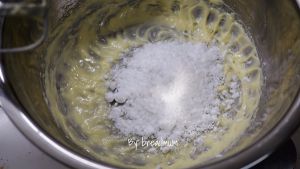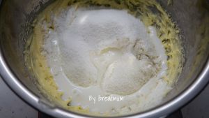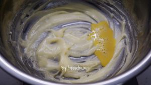将全蛋液分次少量加入打发的黄油中。