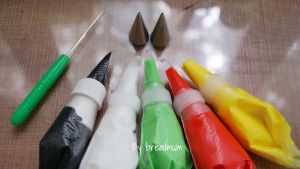 打好的糖霜分别调色,加入相应色素,为绿,红,黄,白,黑,蓝。 之后还需要用到灰色,是在黑色基础上加入多一点白色的糖霜,橙色是黄色中加入一点红色,所以,黑色和黄色可以多调一点。