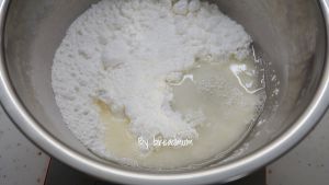 再加入一半的牛奶和筛入一半的低粉,搅拌均匀后再加入余下的牛奶,低粉和奶粉