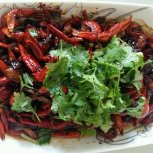 大火开锅之后转文火炖15分钟左右。放入鸡精、味达美少许。出锅,装盘,撒上香菜叶做点缀!一份香辣小龙虾做好了!