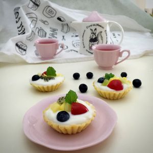 待饼干凉了变脆了,分别倒入酸奶,加入水果,再用点薄荷装饰一下。
