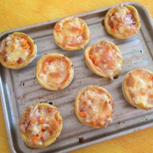 第二步。把红萝卜 洋葱 香肠 切成丁。放进蛋挞皮里。之后把奶酪放在最上面。