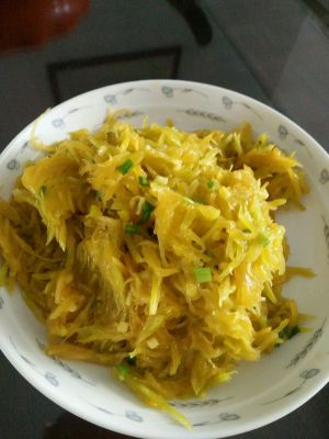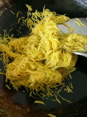 起油锅,下姜末略炒,下南瓜丝翻炒。加适量盐,糖,料酒。最重要的是加生抽,吊鲜。最后加葱末,起锅,馅料完成。