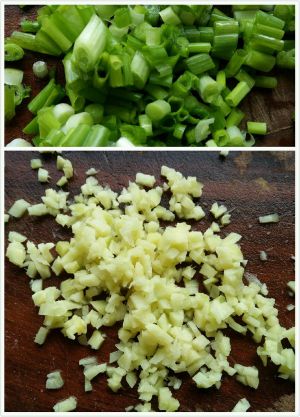 嫩南瓜洗净,剖开去籽,刨成丝。姜,葱,切末