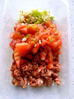 将西红柿,小葱切好,与牛肉混合
