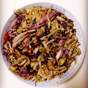鸡蛋两颗打成蛋液 煮好面 面过两三次冷水后滤干水 紫甘蓝切丝 (最好用白色的甘蓝)干辣椒切丝 葱 蒜切片