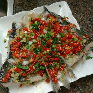 把剁椒三勺平铺鱼头上面,腌十五分钟左右入味点。