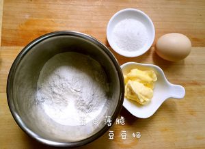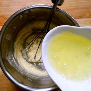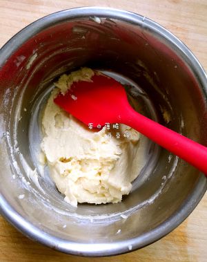 黄油室温软化后加入糖粉拌匀,分三次加入蛋清,每次融合后再加。