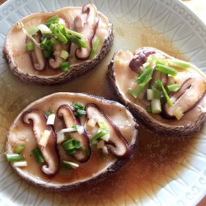 把调料淋上,香菇切片放在鳕上,撒上葱花、姜末,腌制10分钟左右